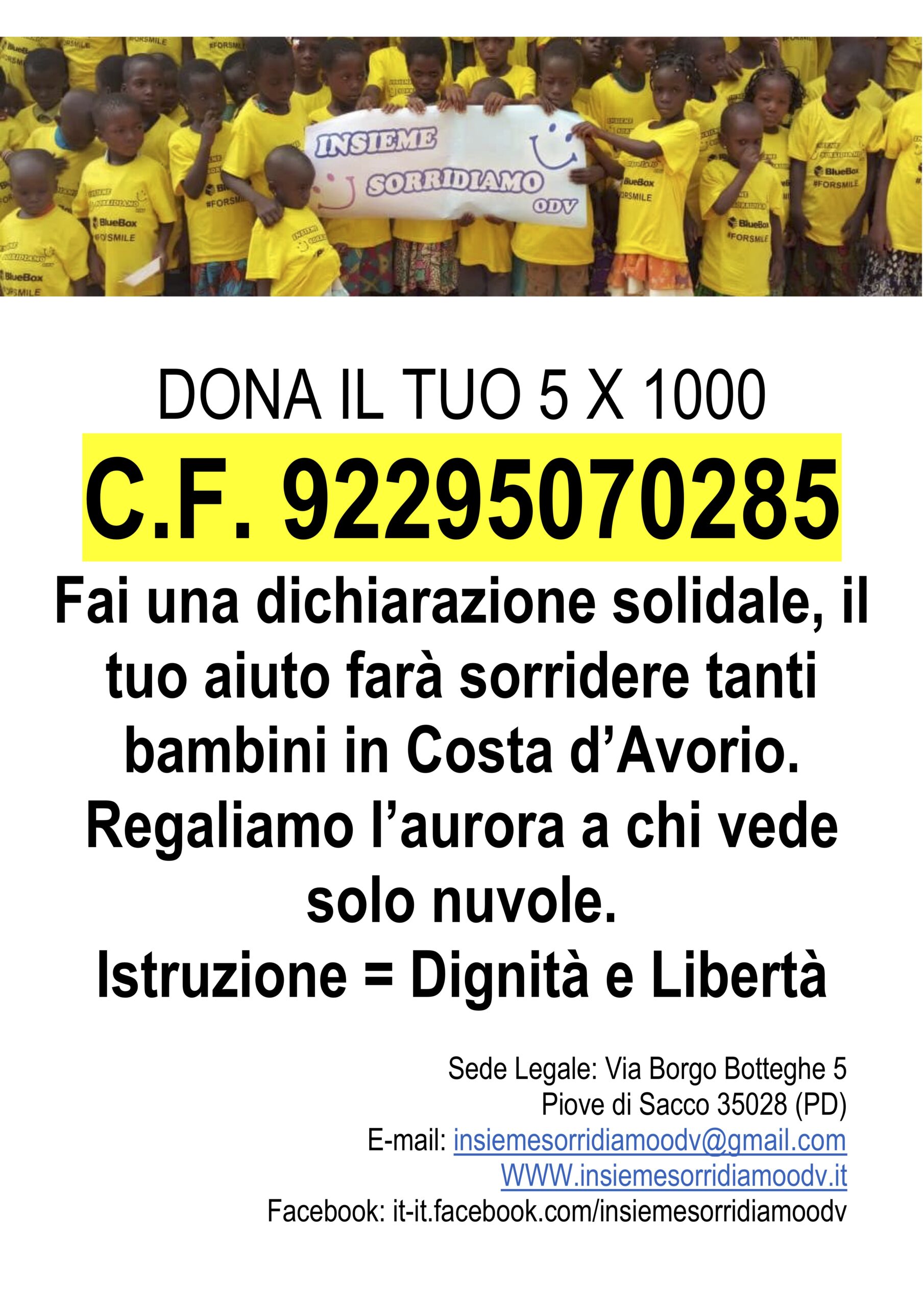 Fai una dichiarazione solidale, il tuo aiuto farà sorridere tanti bambini in Costa d’Avorio. Regaliamo l’aurora a chi vede solo nuvole. Istruzione = Dignità e Libertà